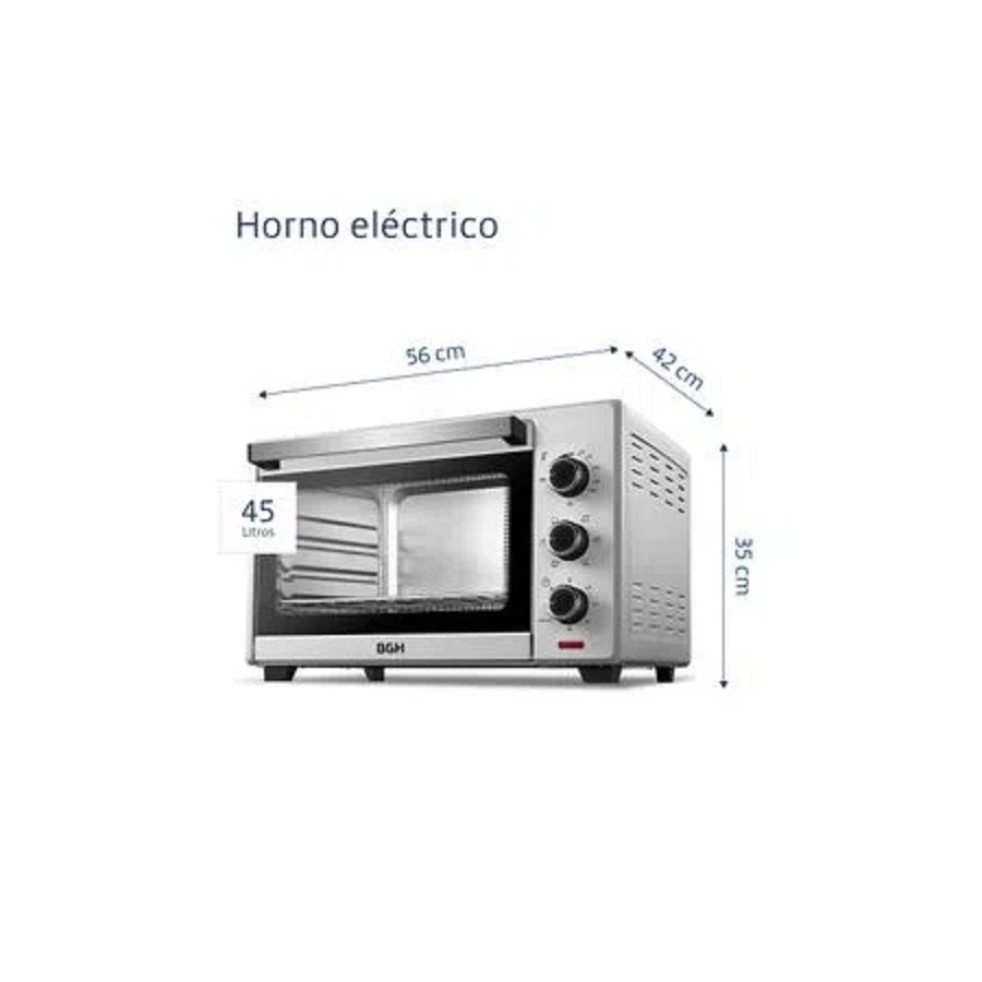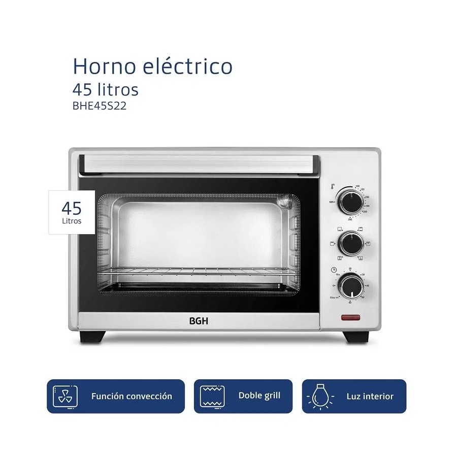 El BGH BHE45S22 es un horno eléctrico con un diseño moderno y funcional en color Silver. Cuenta con una puerta de vidrio amplia y comandos de control accesibles. Su capacidad es de 45 litros.