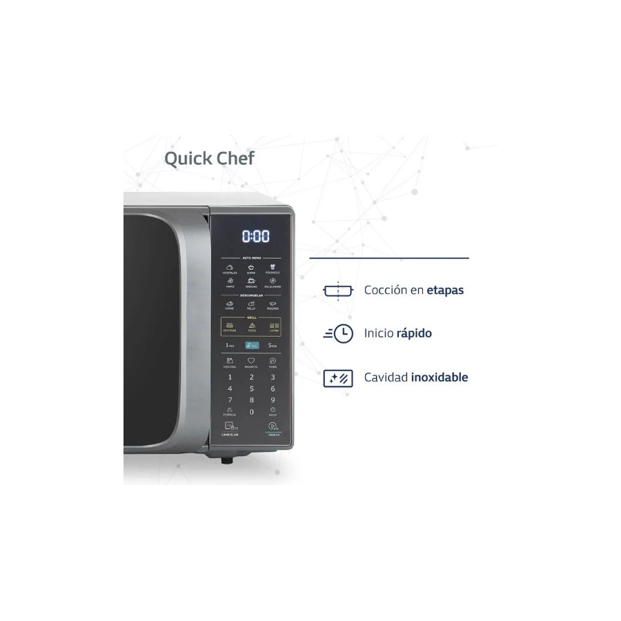 Incluye auto menú, cocción multietapa, descongelamiento por peso o tiempo, inicio rápido, cronómetro y bloqueo para niños, entre otras funciones pensadas para facilitar el uso diario. Gracias a su modo ECO y clase de eficiencia energética B, ofrece un excelente rendimiento con un consumo máximo de 1250W.