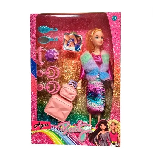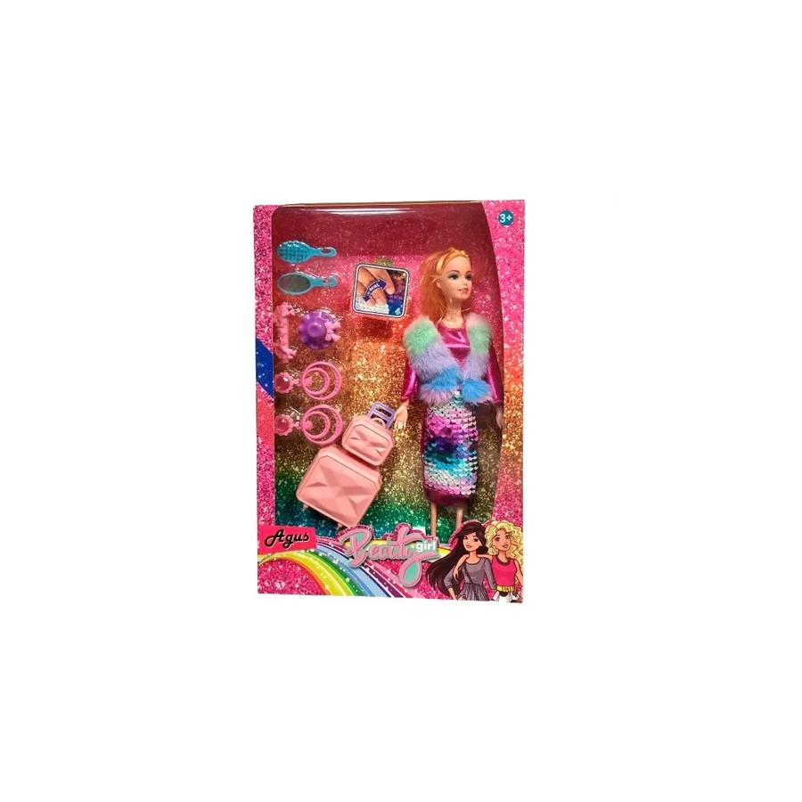 Agus viajera, la muñeca incluye una valija, un peine, un espejo, una hebilla y un par de aretes, lo que potencia aún más el juego. Su diseño articulado proporciona versatilidad en las poses y actividades, enriqueciendo la experiencia de juego. Con un peso liviano y medidas de 28 cm de altura, es fácil de manejar y transportar.