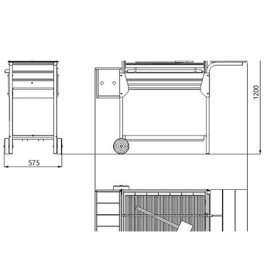 Su leñero facilita el encendido de brasas y su bandeja de apoyo aporta mayor comodidad. Incluye una pala (también enlozada) para el manejo del carbón.