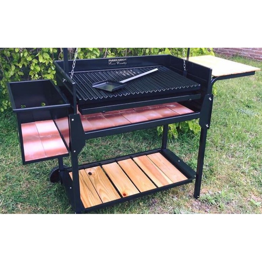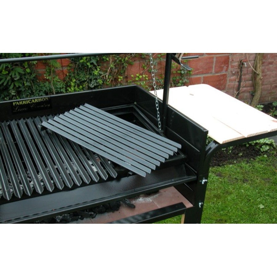 La parrilla se regula mediante un sistema de cadenas. Ésta se desmonta en tres tramos para su mayor comodidad.