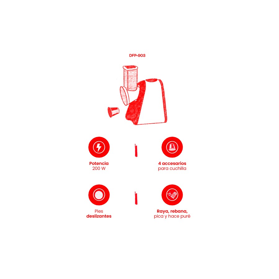 Incluye 4 accesorios para cuchilla que te permiten adaptarla a tus necesidades culinarias. Sus pies antideslizantes garantizan estabilidad y seguridad durante su uso.