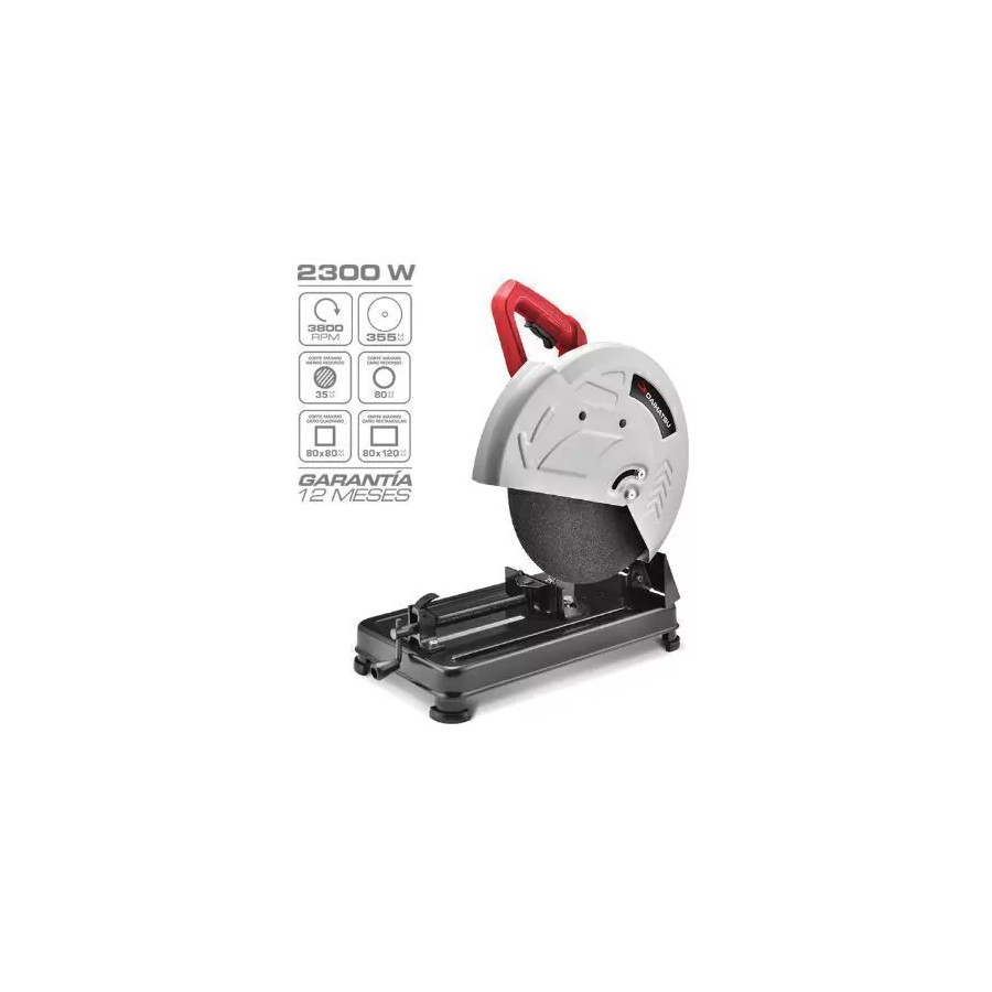 Ficha técnica Voltaje 220 V / 50 Hz -Potencia 2300 W - Velocidad sin carga 3800 Rpm - Diámetro del disco exterior 355 mm - Diámetro del buje 25,4 mm (1”) - Capacidad máxima de corte -Hierro redondo - Caño redondo - Caño cuadrado -Caño Rectangular 35 mm 80 mm - 80 x 80 mm - 80 x 120 mm - Peso 12.3 Kg - Garantía 12 meses