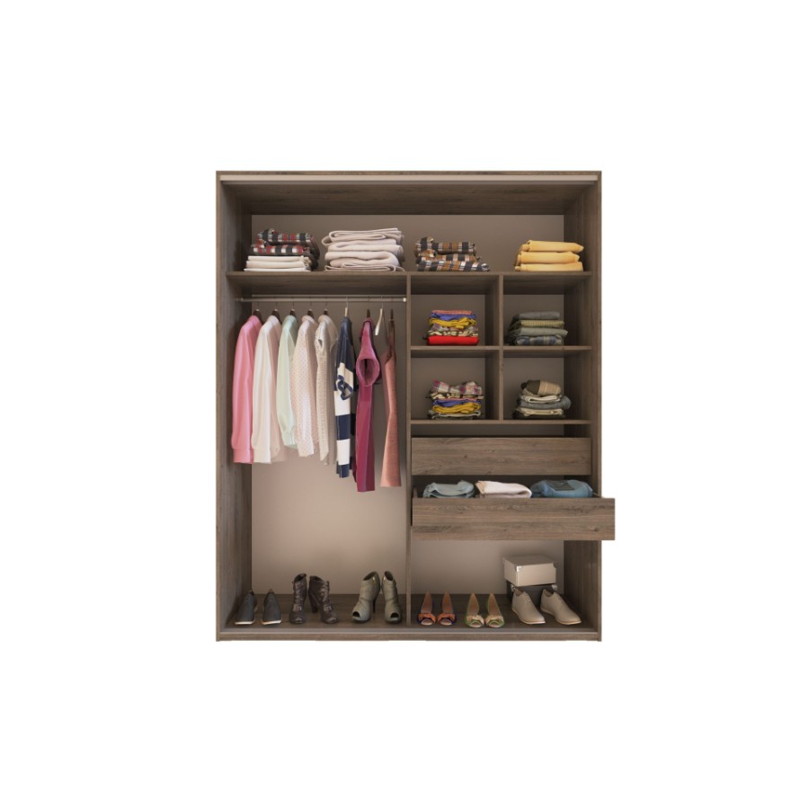 Si estás buscando un mueble funcional y duradero, nuestro Ropero Reflex de 2 puertas corredizas y 2 cajones es la elección perfecta. Fabricado con melamina de alta gama de 15mm MDP, cuenta con correderas telescópicas, guía superior e inferior, tiradores de puertas y perchero en aluminio anodizado. Además, sus ruedas inferiores con amortiguación proporcionan un movimiento suave y sin ruido, garantizando un uso prolongado sin desgaste.