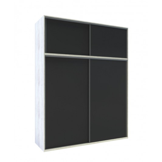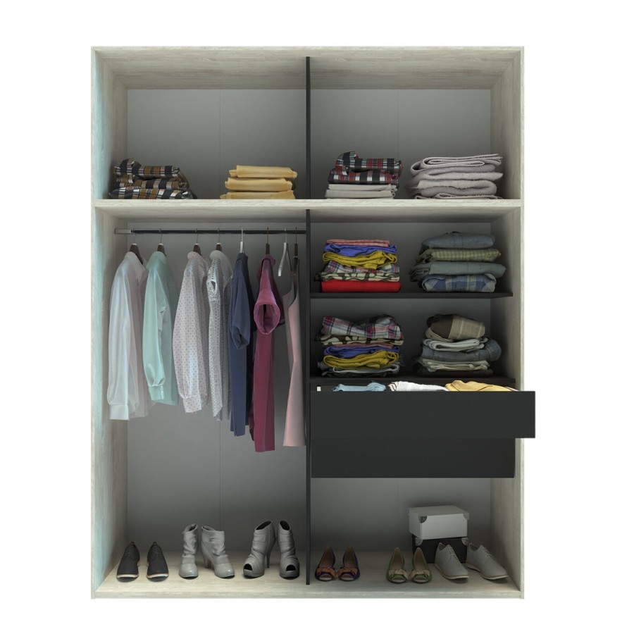 Ropero Duo con baulera, 4 puertas corredizas. Baulera de 65cm de altura. 2 cajones internos con guias telescopicas. Manijon, guias y perchero de aluminio. Melamina de 15mm.