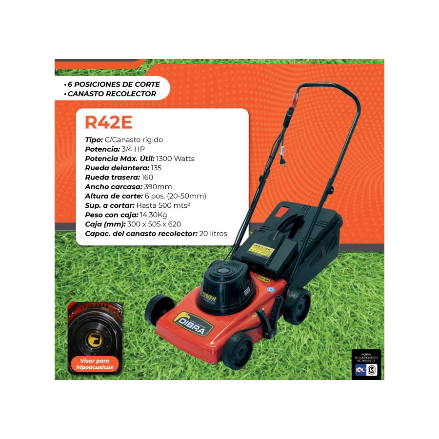 Cortadora de Césped eléctrica con exclusivo Sistema Regulador de 6 posiciones de corte y Canasto Recolector.