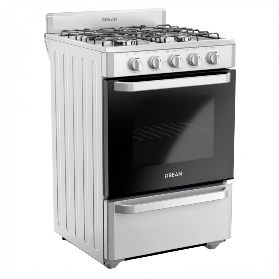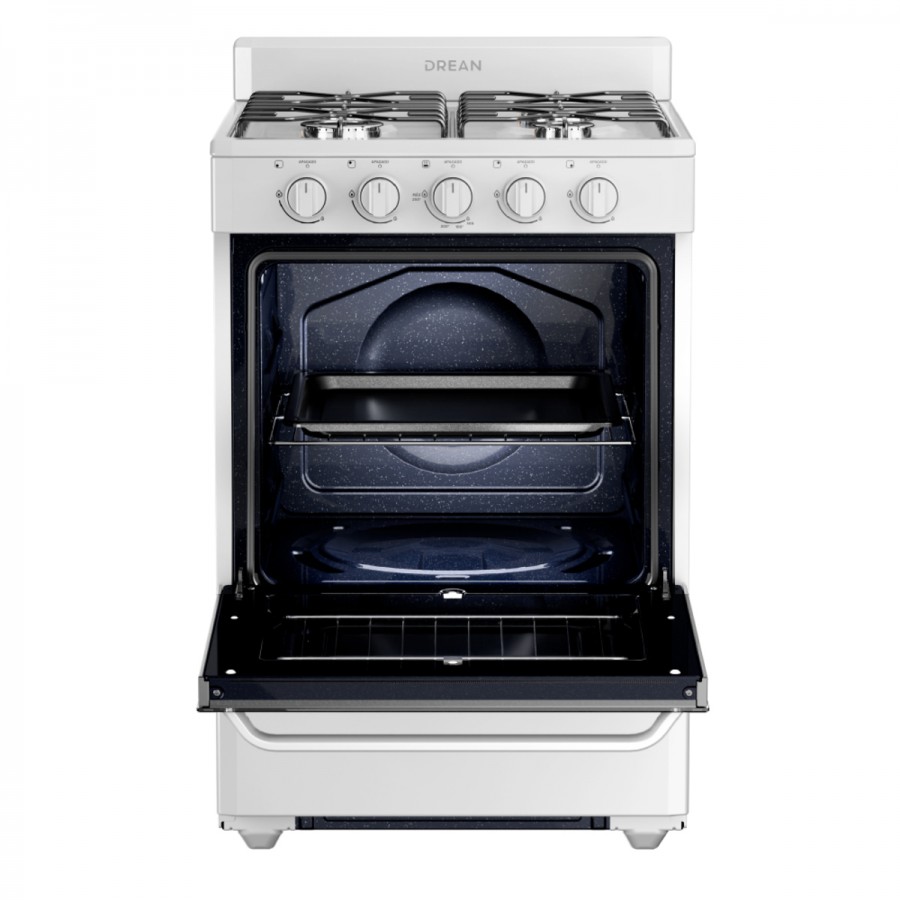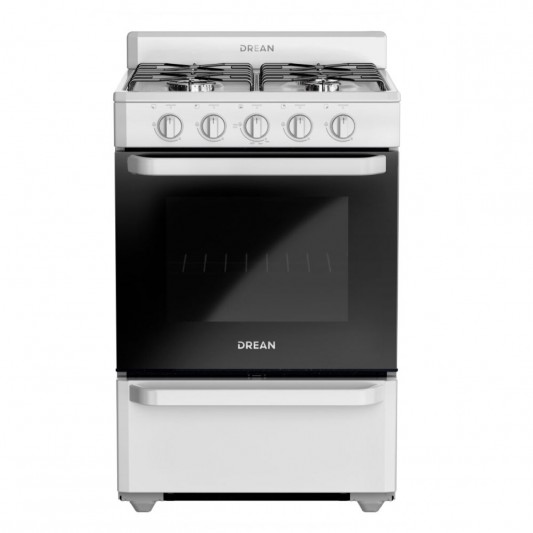 Cocina multigas de 56 cm con 74 litros de capacidad en horno. Color blanco. Cuenta con 2 parrillas superiores de alambrón negro y 1 parrilla en horno cromada. 4 hornallas multitamaños con sensor de flama. Puerta de horno con vidrio panorámico negro. Posee válvula de seguridad, termocontrol en horno y encendido manual con cerillo en horno y hornallas. Sistema de limpieza Easy Clean Pro. Cajón asador rebatible. Incluye kit de instalación, antivuelco y kit de conversión a gas LP. Origen Argentina.