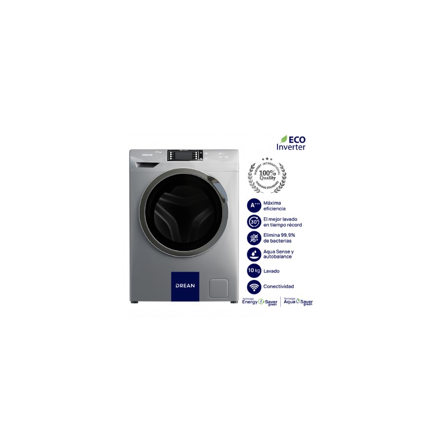 Lavarropas de carga frontal con tecnología Ecoinverter. Su capacidad de lavado es de 10 Kg y su velocidad de centrifugado es regulable hasta 1200 RPM. Color gris. Eficiencia A+++. Lavado europeo. 17 programas de lavado. Conexión WiFi. Display LCD. Posee carga autoadaptativa, función autobalance. Tambor de acero inoxidable con luz interior. Cúpula de vidrio. Sus programas incluyen lavado rápido 30’, ECO, deportivo. Opción vuelvo y termino, inicio diferido y extra enjuague. Origen Argentina.