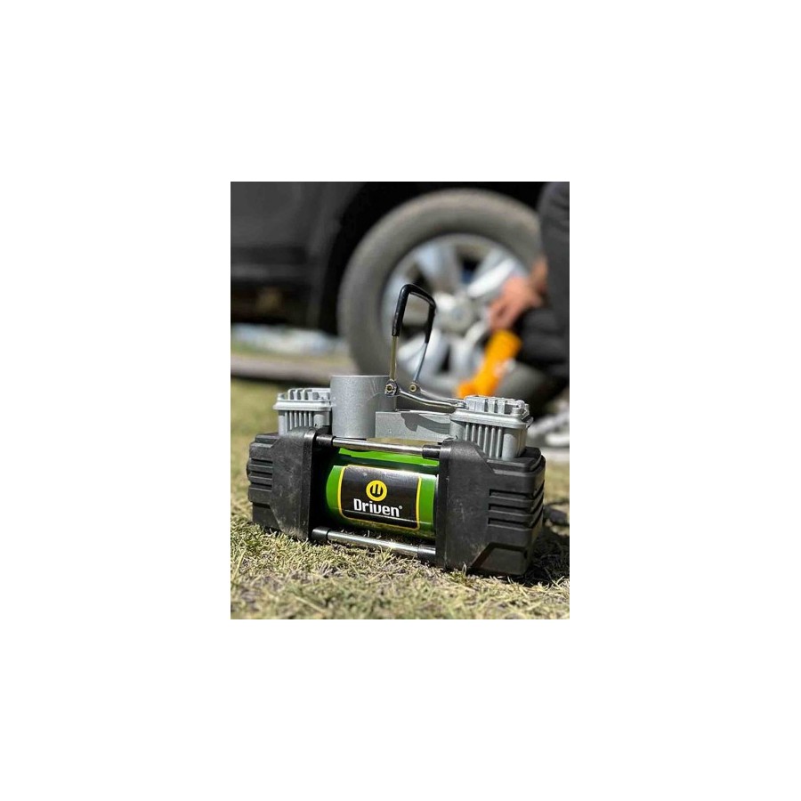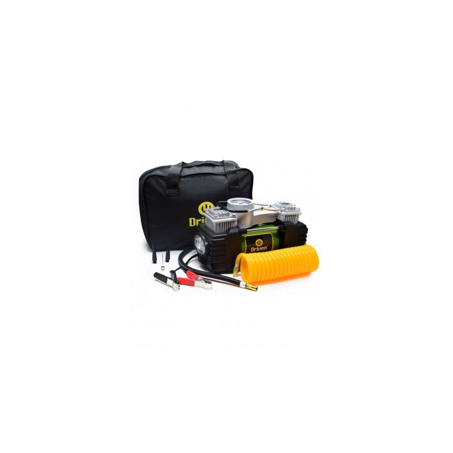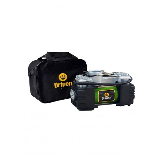 El compresor de aire metálico doble cabezal es ideal para medir la presión de tus neumáticos e inflarlos de manera rápida. De 12v, se conecta a la batería y posee una potente luz LED frontal para facilitar el trabajo nocturno o en zonas con poca visibilidad. Su estructura 100% metálica asegura una máxima durabilidad.
