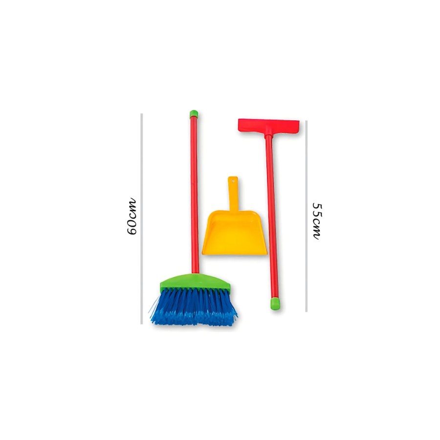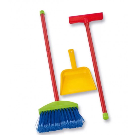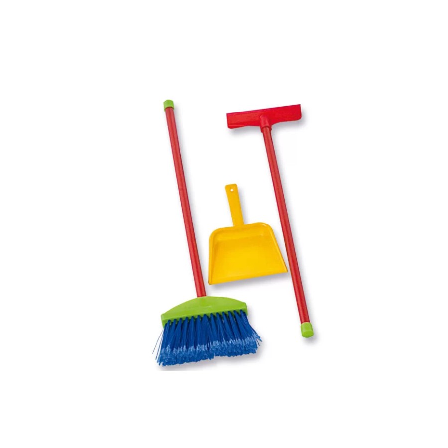 Set de limpieza DURAVIT para niños. Este conjunto incluye tres piezas: una escoba, un secador y una palita. Ideal para que los niños se diviertan mientras aprenden sobre las tareas del hogar.