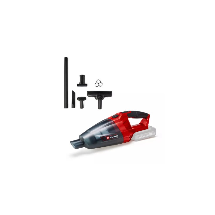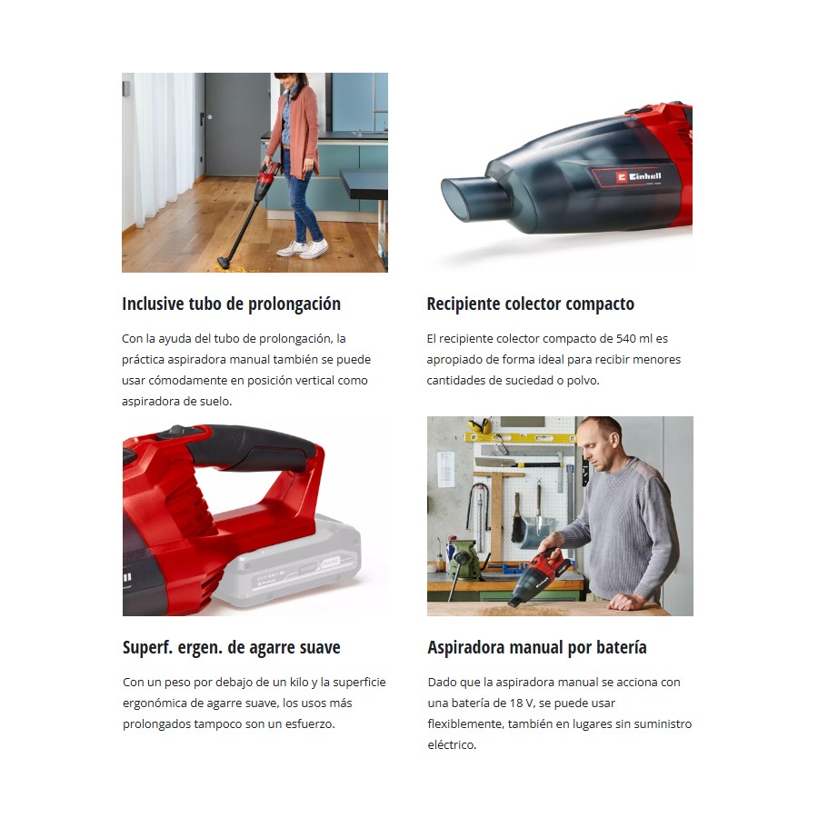 El aspirador de mano sin cable Einhell TE-VC 18 Li-Solo está siempre a mano para limpiar la suciedad y las molestas migas de la alfombra, el sofá o la mesa. Este práctico aspirador pertenece a la familia Power X-Change de Einhell, de eficacia probada. Las baterías recargables de esta serie pueden utilizarse en cualquiera de los productos de la familia del sistema. Los rangos de trabajo cortos, una gran colección de baterías y cargadores diferentes y el bajo rendimiento son cosa del pasado. El aspirador de mano sin cable limpia cualquier superficie en un abrir y cerrar de ojos gracias a las tres boquillas incluidas. La boquilla para suelos está especialmente diseñada para suelos duros y superficies lisas. Hay una segunda boquilla para tapicerías y tejidos. Con la boquilla para hendiduras también puede limpiar zonas de difícil acceso con poco esfuerzo. El tubo de extensión de 46,5 cm le facilita el uso de la cómoda aspiradora sin cable para limpiar los suelos mientras está de pie. El depósito de polvo tiene una capacidad de 540 mililitros. Para ahorrar espacio hay un soporte de pared integrado. Este producto se suministra sin batería ni cargador, que están disponibles por separado