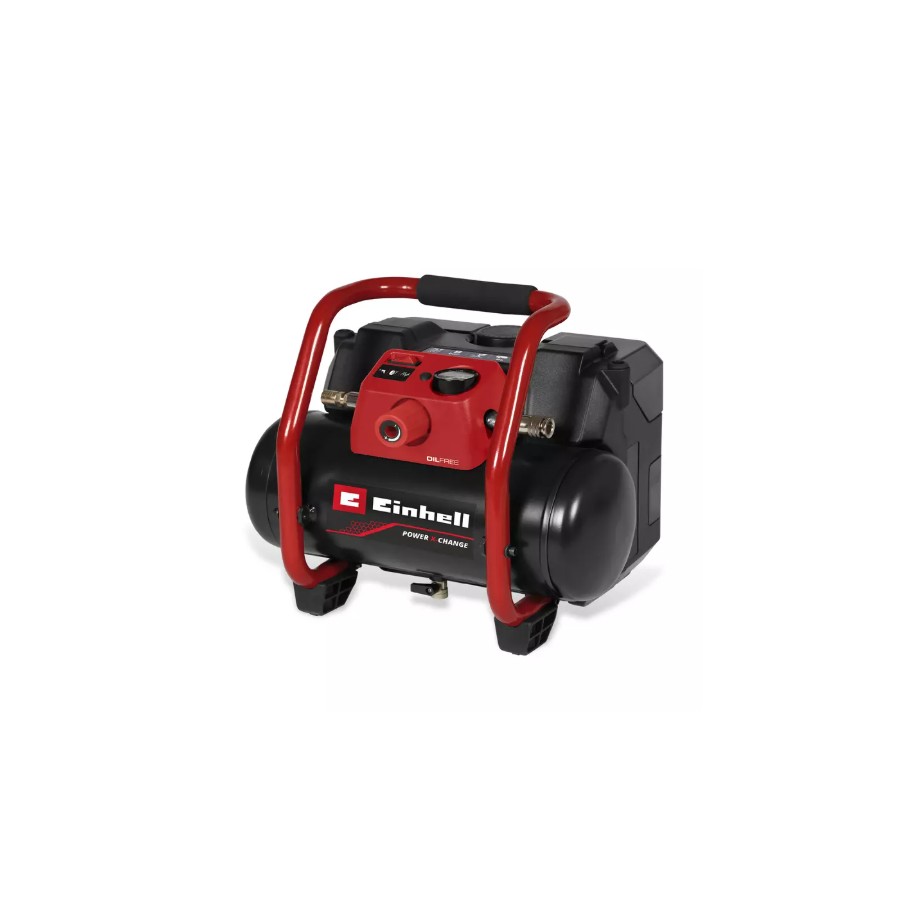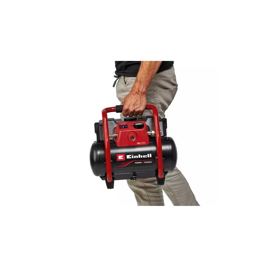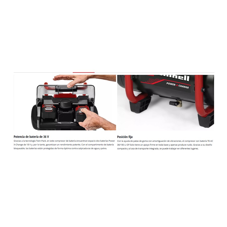Con el compresor inalámbrico Einhell TE-AC 36/150 Li OF-Solo, no se quedará sin aire fácilmente, ya sea en el taller o en el garaje. Esto es gracias al potente y portátil compresor inalámbrico, con su depósito de 6 litros, máx. 8 bar de presión de funcionamiento y capacidad de admisión de 150 litros. 8 bares y una capacidad de aspiración de 150 litros por minuto. Está alimentado por la tecnología Twin-Pack, que utiliza un par de baterías Power X-Change de 18 V. El compartimento de la batería puede sellarse para proteger las dos baterías contra salpicaduras de agua y polvo. La bomba no necesita aceite ni mantenimiento, por lo que el esfuerzo de mantenimiento es mínimo. La salida de presión de trabajo regulada está equipada con un manómetro y un acoplamiento rápido. La presión de trabajo deseada puede ajustarse manualmente mediante el regulador de presión. La portabilidad es una de las grandes ventajas de los aparatos sin cable, por lo que el asa de transporte integrada forma parte integral del diseño. Con sus pies de goma y amortiguación de vibraciones, el compresor de 9,7 kg es estable y apenas genera ruido durante su funcionamiento. Para facilitar el mantenimiento, dispone de una válvula de drenaje para vaciar el agua condensada. El diseño incluye un práctico compartimento para accesorios que permite tenerlos a mano en cualquier lugar. El aparato no incluye batería ni cargador. Se venden por separado.