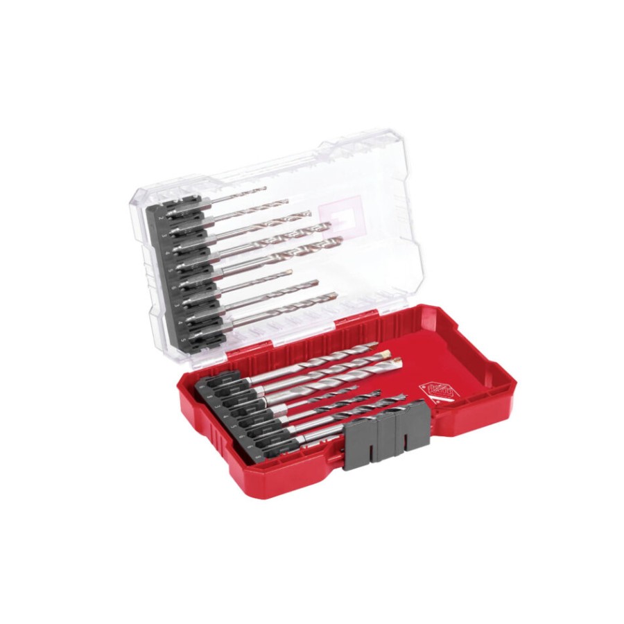 Tienen una punta de centrado que garantiza un posicionamiento exacto y resultados de perforación precisos. Para taladrar en mampostería y arenisca calcárea se incluyen 6 brocas para piedra (3 / 4 / 5 / 2x 6 / 8 mm) de acero al carbono forjado.