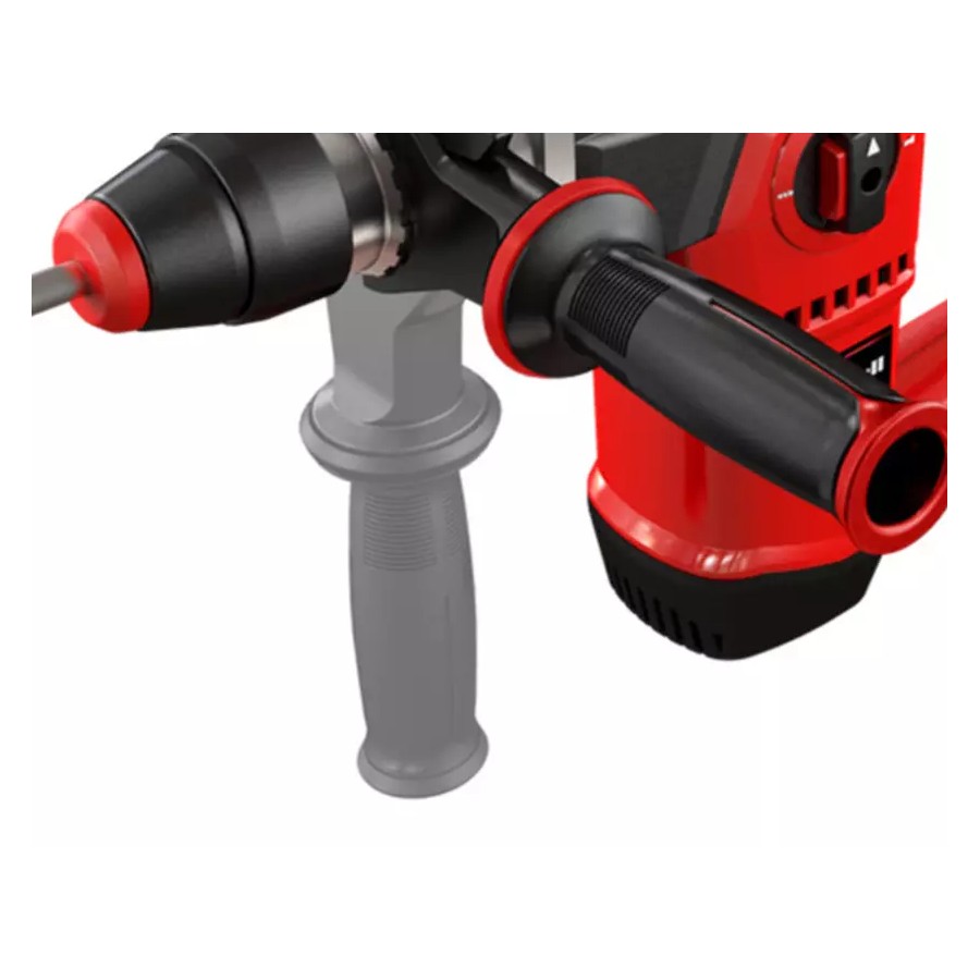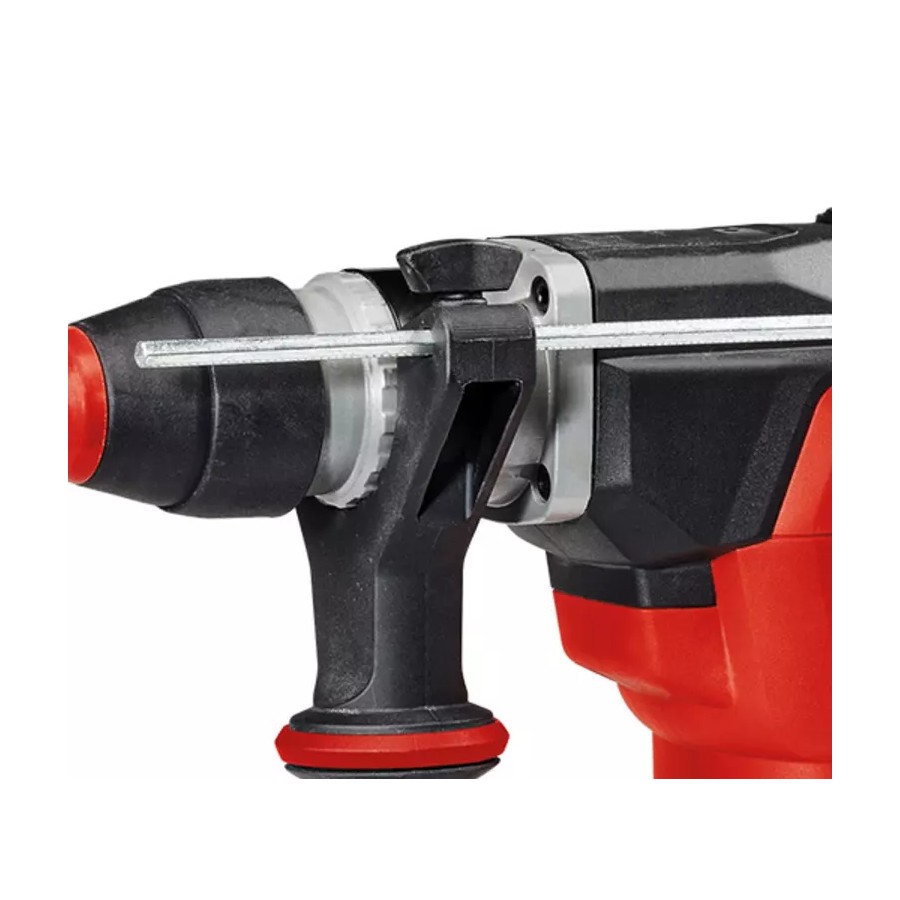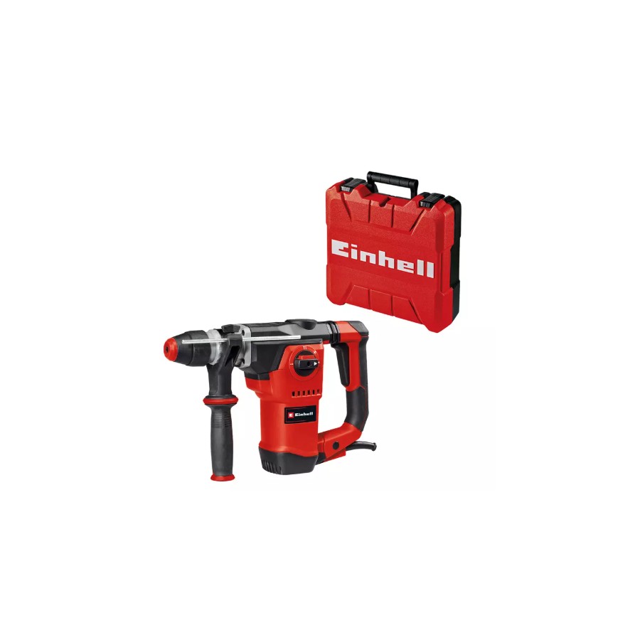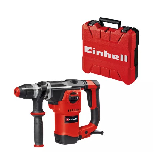 La empuñadura amortiguada a oscilaciones con superficie de agarre suave se complementa por una empuñadura adicional con estriado. Así el equipo puede guiarse de forma precisa, también en condiciones difíciles. El martillo perforador TE-RH 32-1600 4F de Einhell se suministra con un practico maletín de transporte y almacenamiento.