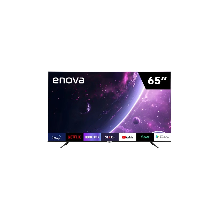 TV enova con sistema operativo android tv. Diseño elegante de 65 pulgadas y bordes ultradelgados. Imagen nítida. Gracias al sistema operativo, es posible acceder e instalar todas las apps permitidas por Google Play. Además el TV cuenta con chromecast para compartir y transmitir pantalla y control por comando de voz, gracias al micrófono incorporado en el control remoto.