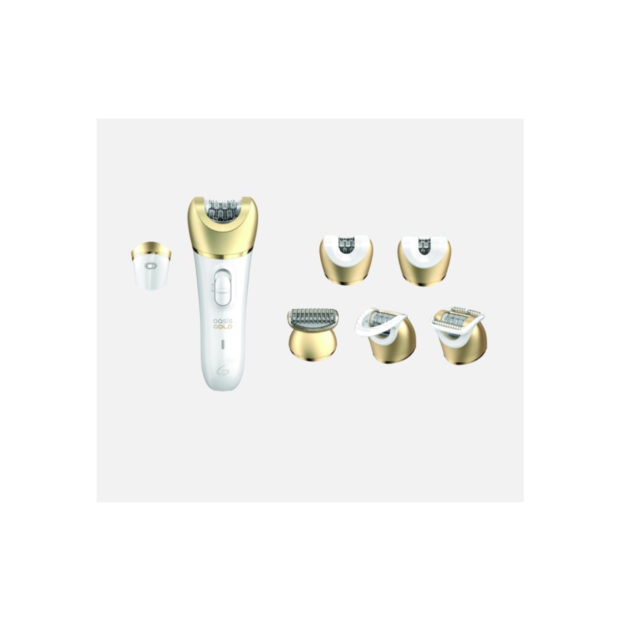 La cabeza de afeitado de Oasis Gold asegura una depilación precisa y suave en varias áreas del cuerpo. Para las zonas más sensibles, se incluye una cabeza especialmente diseñada para la eliminación del vello no deseado en el rostro, axilas y área del bikini. El estirador de piel acompaña el proceso, asegurando una depilación aún más cómoda.