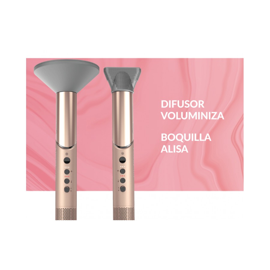 Es una herramienta versátil que seca, modela, alisa, riza, ondula, da volumen, suaviza y define, integrando la innovadora tecnología Efecto Coanda que atrae el cabello automáticamente para lograr peinados duraderos y rizos más definidos.