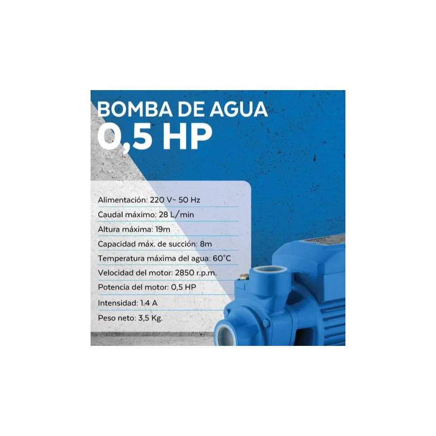 La Bomba de agua periférica Gamma BPG-786 es la solución perfecta para uso doméstico y de jardín, diseñada para garantizar un suministro de agua confiable y eficiente. Con un motor de 0.5 HP (0.37 kW) y alimentación 220 V~ 50 Hz, alcanza un caudal máximo de 28 litros por minuto y una altura máxima de impulsión de 19 metros, con capacidad de succión de hasta 8 metros.