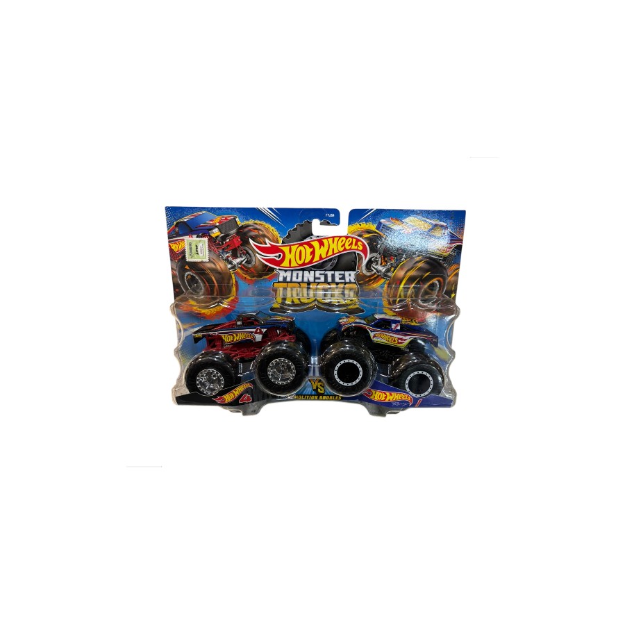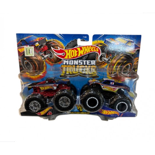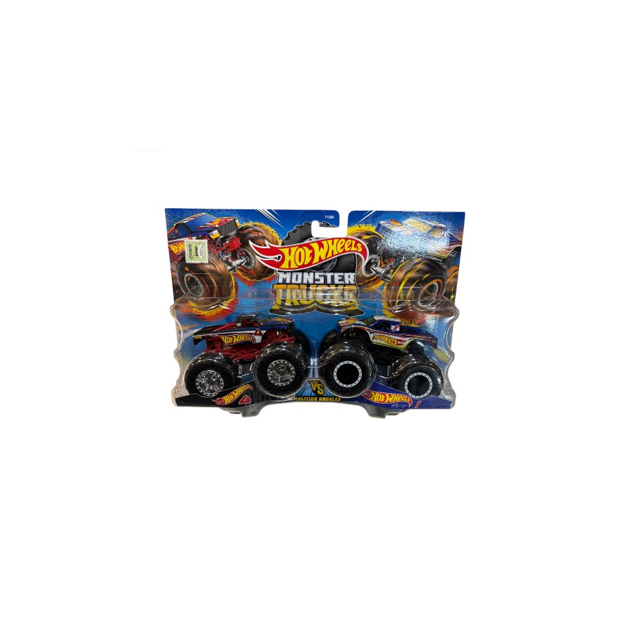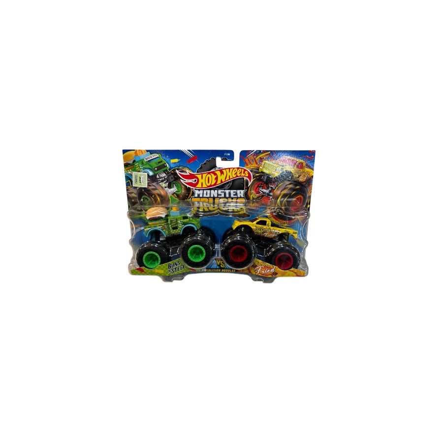 Los Hot Wheels Monster Trucks 1:64 Scale Demolition Doubles ¡Los dos paquetes duplican la acción con dos Monster Trucks listos para enfrentarse en batallas cara a cara! Cada uno de los dos vehículos a escala 1:64 tiene ruedas GIGANTES y grandes personalidades. Los dúos están emparejados a propósito para ataques de choque épicos: busque los antecedentes y las estadísticas de cada uno en el paquete, incluido el nombre, el tipo de camión, la fuerza, el ataque de choque único y la motorización para una gran diversión narrativa.
