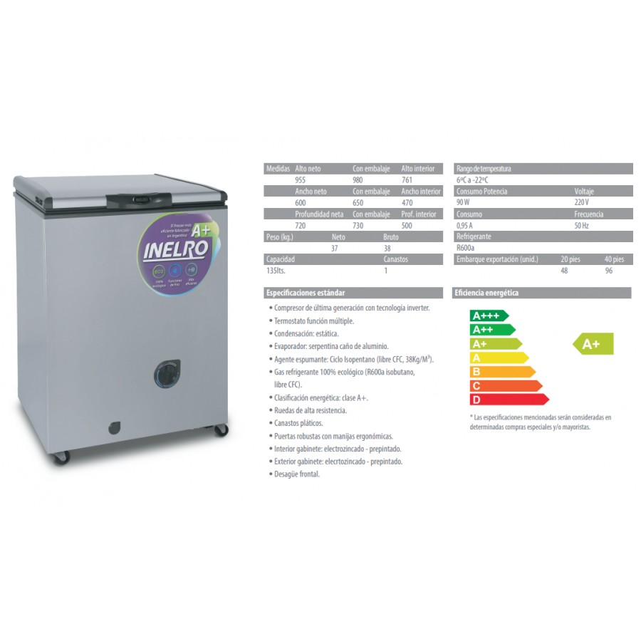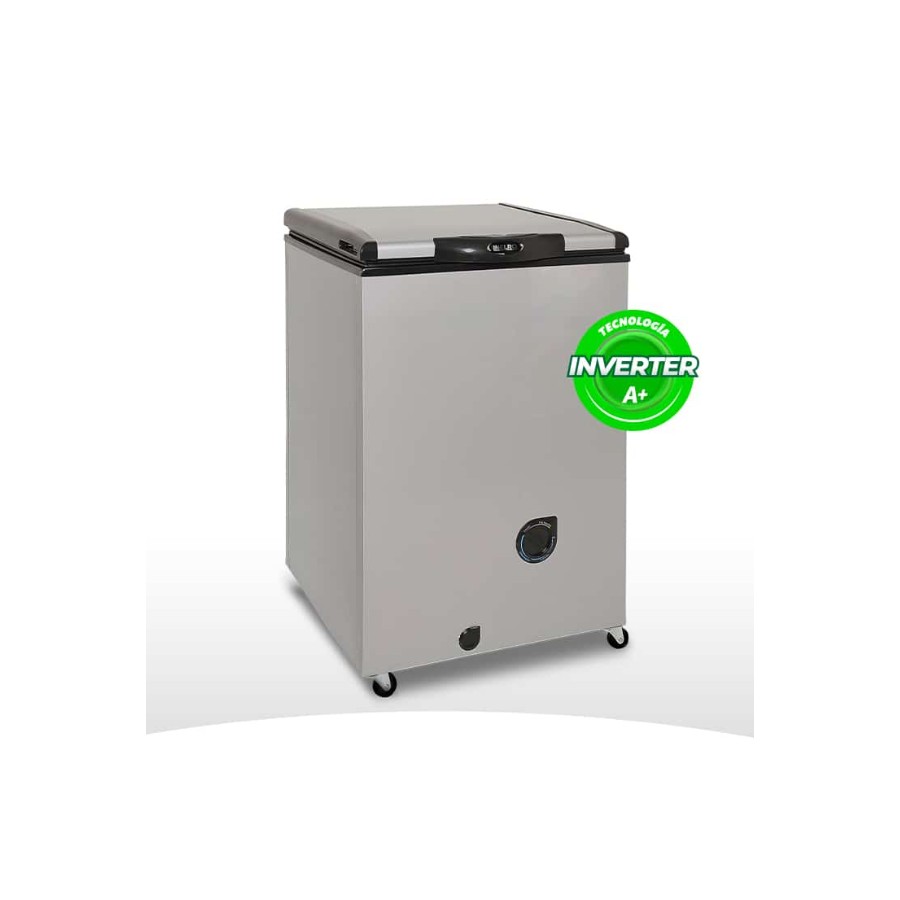 Freezer Full-4 Funciones de Frío. Color Gris Plata. Nuevo tablero, Un Canasto, Ruedas Giratorias de alta resistencia, Interior en chapa pre pintada blanca, Desagote Frontal. Refrigerante R600a. Tecnología Inverter. Eficiencia Energética A+.
