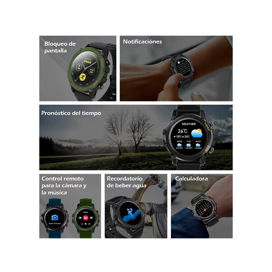 Características destacadas: - Caja de plástico y malla de silicona, resistentes al agua y polvo con certificación IP67. - Monitoreo de frecuencia cardíaca y presión sanguínea, para cuidar tu salud en todo momento. - Recibe llamadas, mensajes de WhatsApp y SMS directamente en tu muñeca. - Múltiples funciones como alarma, cronómetro, y recordatorios de hidratación y sedentarismo. - Modo multideporte que incluye actividades como correr, bicicleta, y más.
