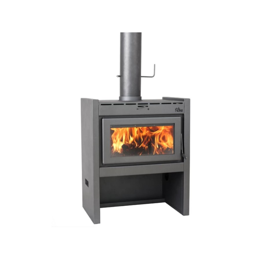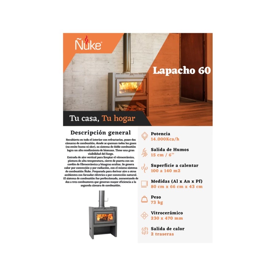 Todo su interior está recubierto con refractarios, posee dos cámaras de combustión, donde se queman todos los gases (no emite humo ni olor), su sistema de doble combustión logra un alto rendimiento de biomasa. Tiene una gran visibilidad del fuego. Entrada del aire vertical para limpiar el vitrocerámico , pintura de alta temperatura, cierre de puerta con un cordón de fibrocerámica y bisagras ocultas. Se genera calor por convección y por radiación, con el mismo sistema de combustión Ñuke.