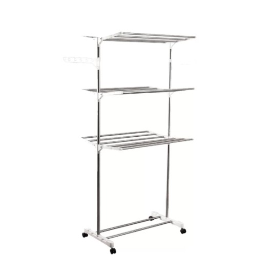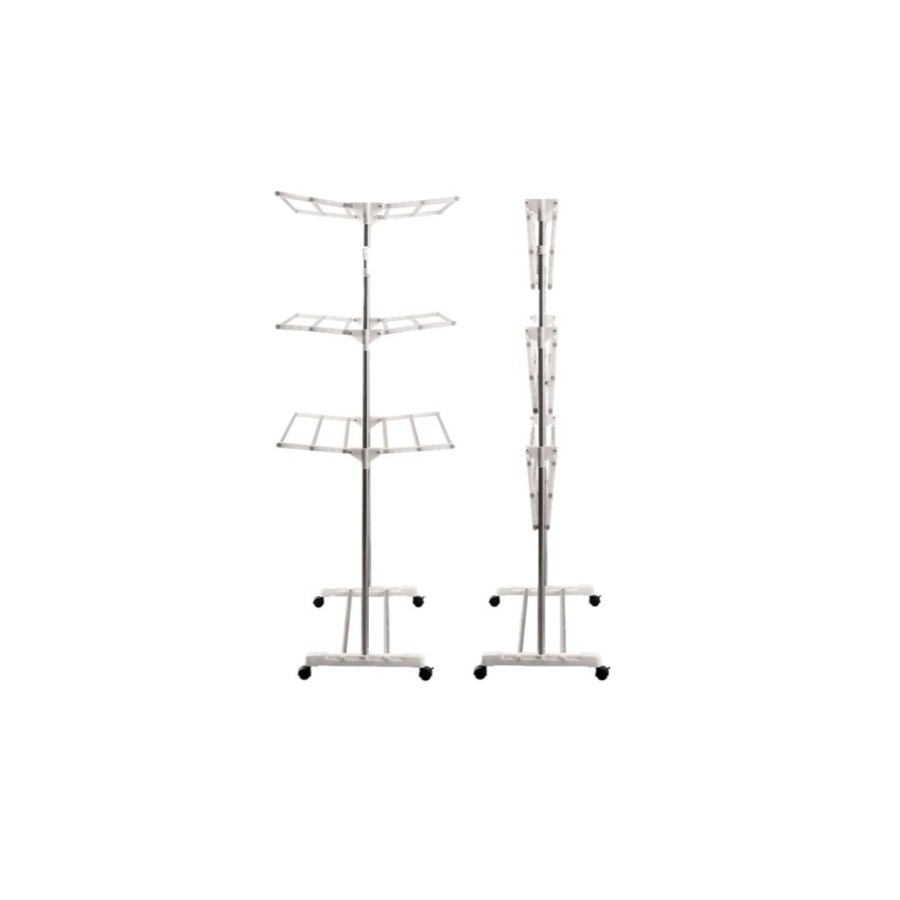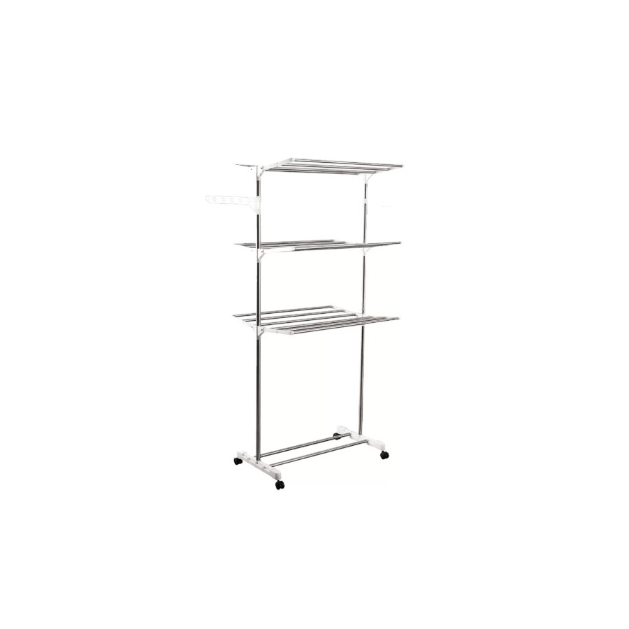 Ideal para espacios reducidos. Fácilmente instalable, es plegable y liviano para trasladar. Es ideal para balcones y patios. - Con brazos plegables, ideal para guardar en espacios reducidos y tres niveles de rejilla. - Con ruedas giratorias y dos porta perchas laterales, ideales para colgar camisas y prendas pequeñas.