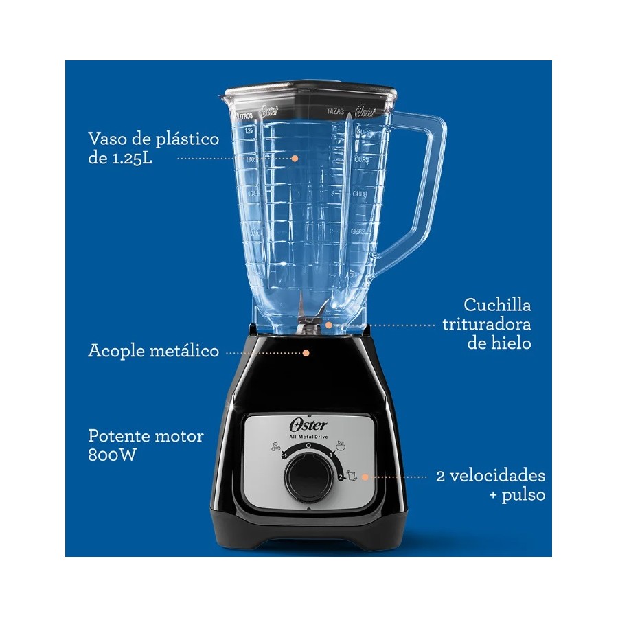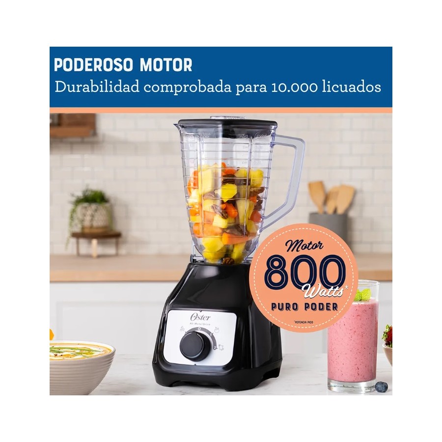 La licuadora Oster® con control de perilla y su potente motor 4 veces más duradero** con 800 W de potencia* te ayuda a preparar deliciosas y saludables recetas. Con alta fuerza de torsión, acople metálico 10 veces más fuerte***, revolucionaria cuchilla trituradora de hielo y vaso de plástico es ideal para preparar una amplia variedad de recetas frías y calientes, jugos, batidos y mucho más.