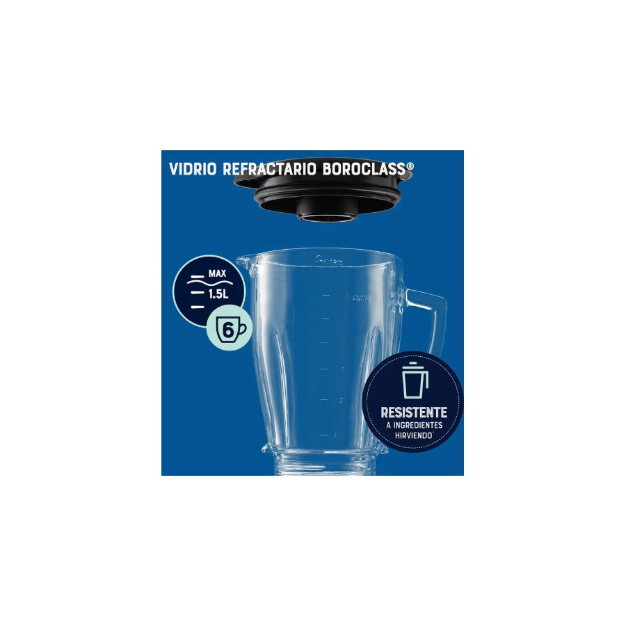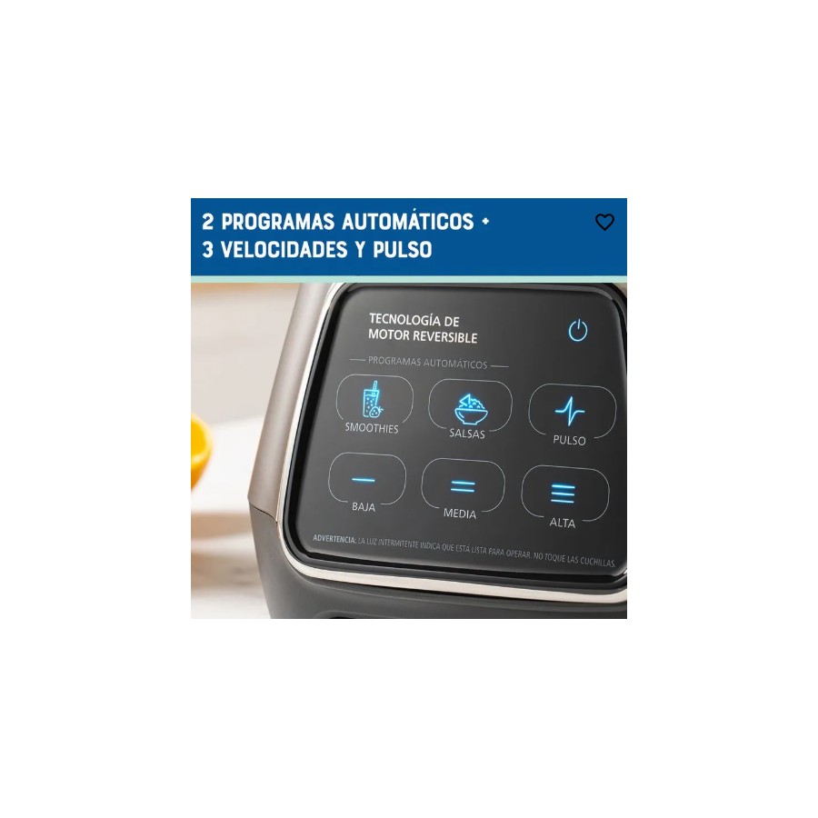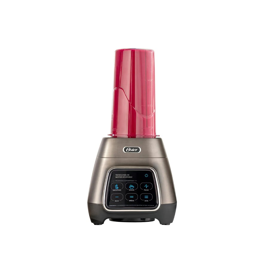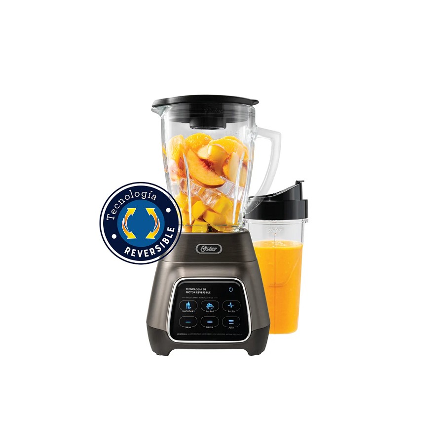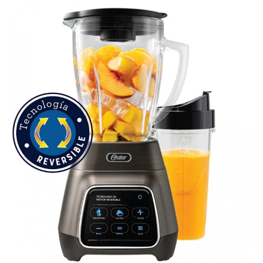 ¡Ya no tienes que dar más vueltas a la hora de cocinar! Gracias a la nueva licuadora Oster® con una moderna pantalla con controles de tecnología táctil que ofrece dos programas automáticos para smoothies y salsas. También incluye tres velocidades manuales y una función de “Pulso”. La pantalla táctil es practica y fácil de limpiar. Su Tecnología de Motor Reversible que ofrece una nueva cuchilla dos veces más grande** con seis aspas de acero inoxidable que garantizan un mejor resultado. La forma en “S” de sus cuchillas y su ángulo plano y más ancho, la hacen ideal para rebanar y obtener salsas y masas con texturas adecuadas. Su posición y su diseño mantienen los ingredientes en continuo movimiento, para que no queden en el fondo de la jarra y se mezclen bien. Su potente motor con 1000 W de potencia**** junto con su tecnología de motor reversible y acople metálico 10 veces más fuerte*** garantizan la consistencia perfecta en diferentes tipos de recetas. Cuenta con dos programas automáticos para smoothies y salsas. También incluye tres velocidades manuales y una función de “Pulso”. El vaso de vidrio refractario Boroclass con capacidad de 1,5L (6 tazas) es resistente a ingredientes hirviendo* y soporta cambios bruscos de temperatura. La tapa incluye una cuchara medidora de 60ml. Todas sus partes son desmontables para una fácil limpieza. Incluye un vaso Blend-N-Go portátil de 750 ml de Tritan™ que brinda todos los beneficios de un vaso de vidrio en un material resistente, inodoro y no tóxico.