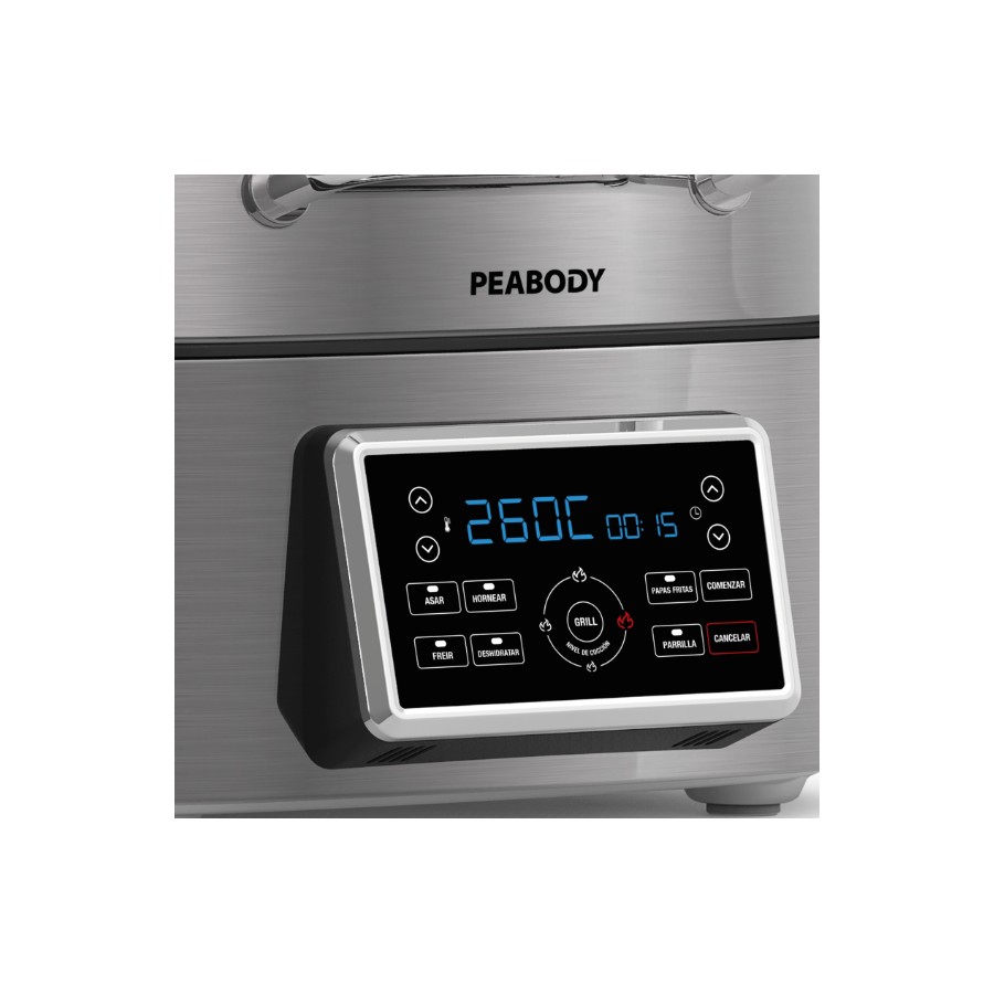 - 7 programas predeterminados: “Hornear, Asar, Grillar, Deshidratar, Freír, Papas Fritas y Parrilla”.
