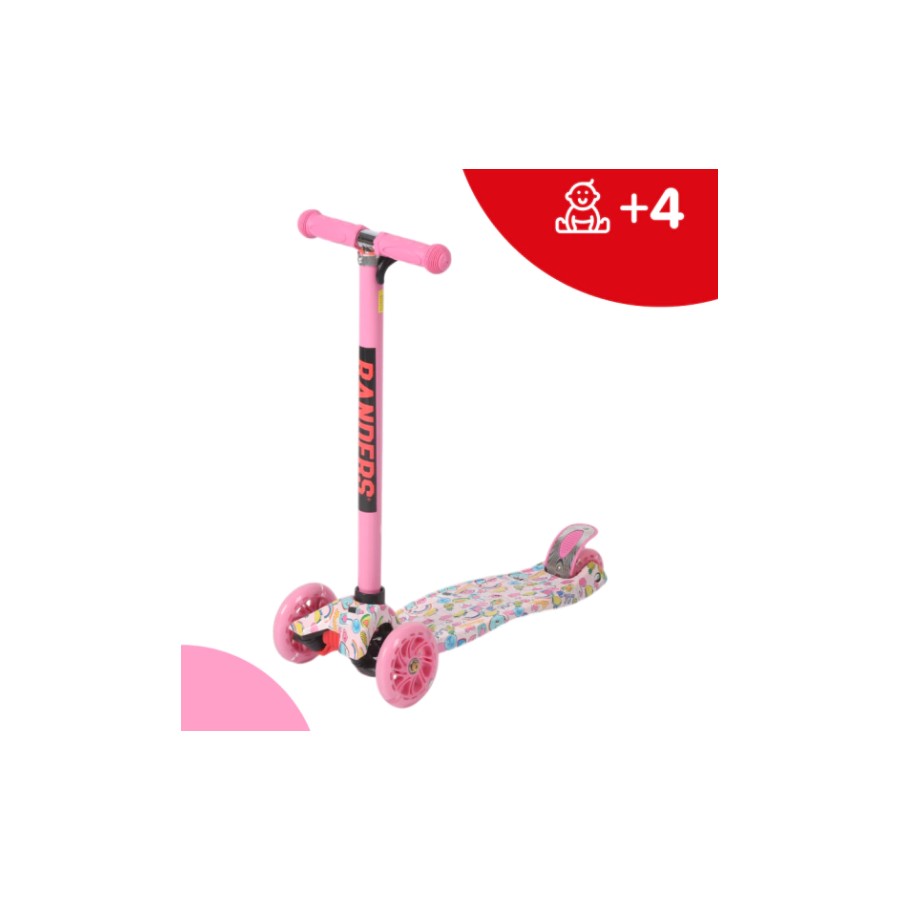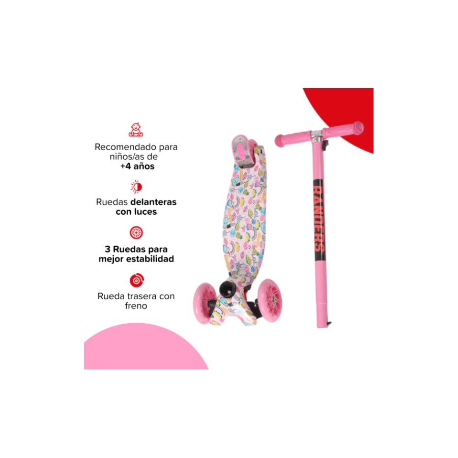 El Scooter Randers es ideal para niños que están aprendiendo a manejar, ya que su diseño de cuatro ruedas y freno trasero lo hace seguro y fácil de usar. Incluye luces en las ruedas, estructura liviana y sistema plegable para guardado cómodo.