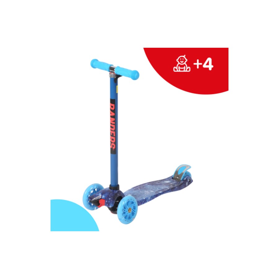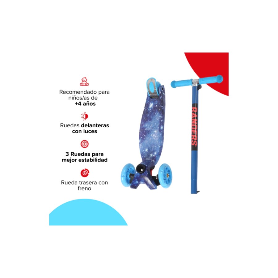 El Scooter Randers es ideal para niños que están aprendiendo a manejar, ya que su diseño de cuatro ruedas y freno trasero lo hace seguro y fácil de usar. Incluye luces en las ruedas, estructura liviana y sistema plegable para guardado cómodo.