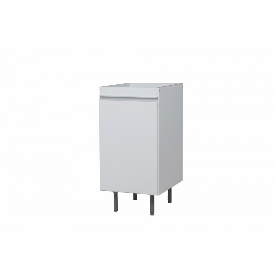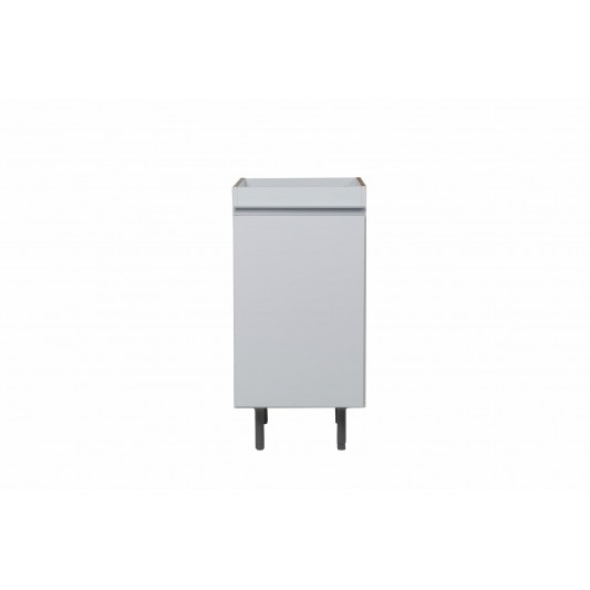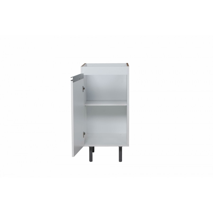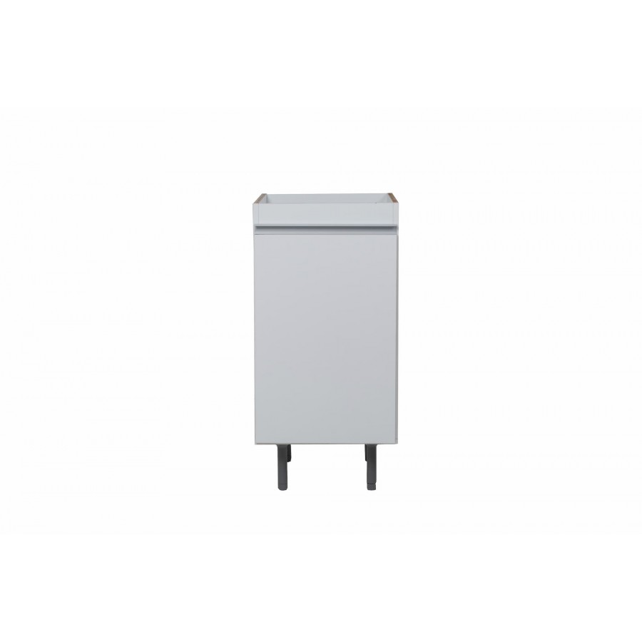 Nuestra cocina Arco, con cuerpos y puertas en melamina 15mm. Correderas de cajón metálicas, bisagras de cierre automático y finos tiradores de aluminio anodizado.