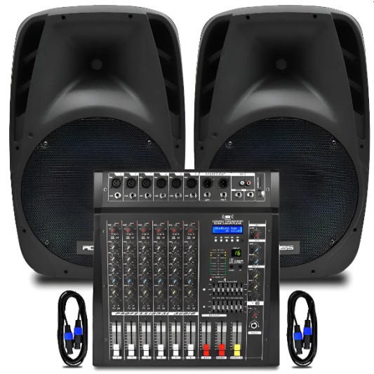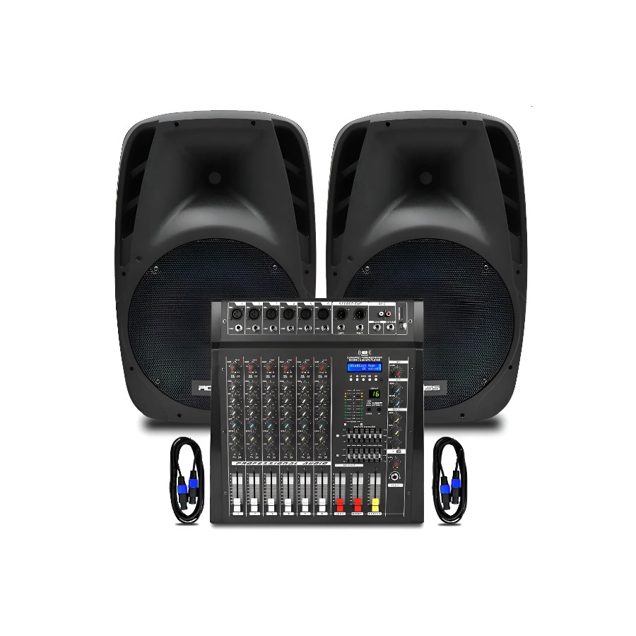 Incluye una consola potenciada Ross DX-6L de 6 canales, dos bafles pasivos Ross RPP-1219-2 y dos cables Speakon Ross RO-B210-6M para conexión directa.