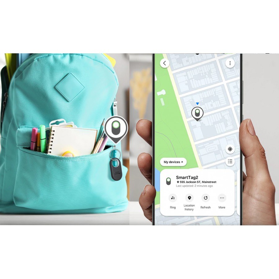 El rediseño del Galaxy SmartTag2 es cómodo de etiquetar y transportar, duradero con clasificación IP67 de resistencia al polvo y al agua, le brinda acceso remoto a sus dispositivos IoT y está activo por hasta 500 días o incluso hasta un 40% más en el modo de ahorro de energía.