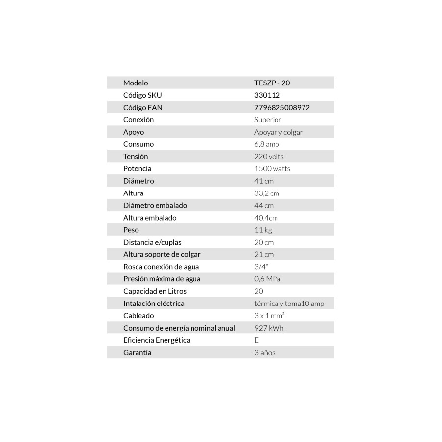 El termotanque TESZP-20 es la solución perfecta para satisfacer tus necesidades de agua caliente en el hogar. Diseñado con la última tecnología y materiales de alta calidad, este calentador de agua ofrece un rendimiento excepcional y una larga vida útil.