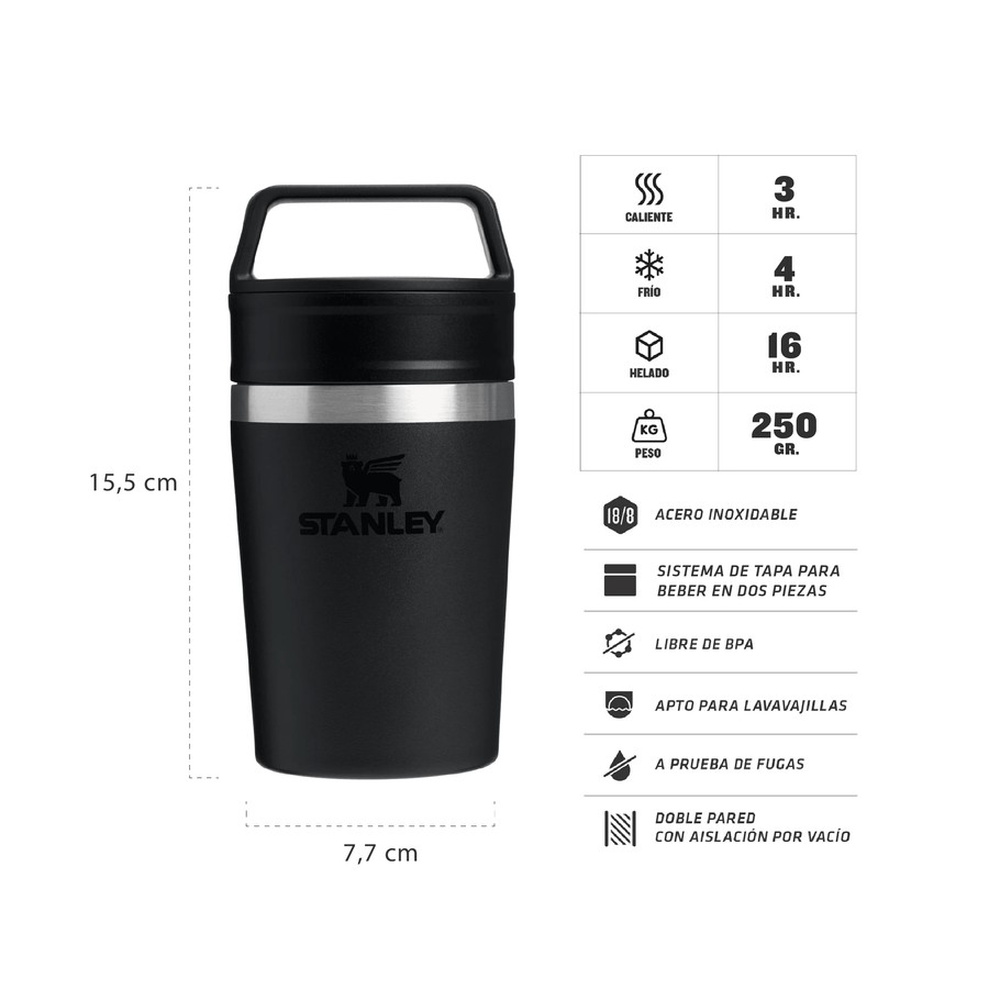 Chiquito pero rendidor. Este vaso térmico compacto es ideal para llevar tu café: mantiene un espresso bien caliente o una bebida con hielo bien frío durante horas. Viene con un diseño mejorado y más espacio en el asa. La tapa de dos piezas es 100% a prueba de derrames y permite tomar cómodamente. ¡Además entra perfecto en el portavasos del auto!