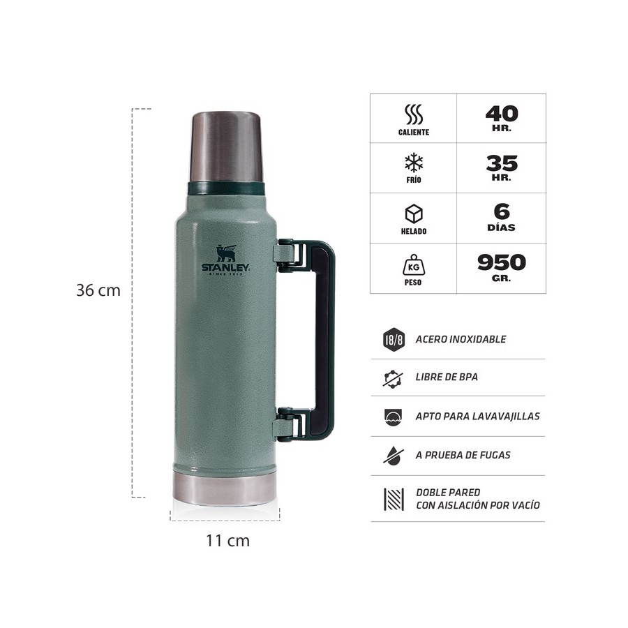 La palabra que viene a la mente es "icónico": diseño elegante, construcción robusta y una actitud indescriptible. Totalmente a prueba de fugas y capaz de mantener las bebidas calientes durante 40 horas, frías durante 45 horas o con hielo durante 6 días. Con el termo Stanley nunca tendrás que preocuparte de que el agua se enfríe o que tu bebida se caliente. Gracias a su pared externa de acero grueso obtendrás un rendimiento térmico que te durará a través de los años.