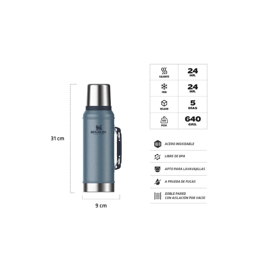 El icónico termo Stanley de 950 ml ha marcado las aventuras al aire libre durante generaciones. Obtén este clásico y disfruta de una vida de bebidas calientes y recuerdos compartidos. La construcción robusta y el aislamiento al vacío de esta botella significa que puede manejar cualquier cosa, todo mientras mantiene sus bebidas calientes y frías durante un día completo. Lo suficientemente delgado como para sostenerlo con una mano, incluso tiene un tapón giratorio para un vertido más suave. La tapa aislada también sirve como taza para beber.