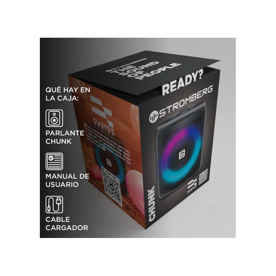 El parlante Stromberg Chunk no es solo un dispositivo, es una puerta hacia un universo de emociones y experiencias. Sus luces LED RGB te guiarán en un viaje lleno de música, ya sea bajo el sol radiante, en la serenidad de tu hogar o en un relajante baño de burbujas, el Stromberg Chunk te ofrece la banda sonora perfecta. Con una resistencia a salpicaduras, la música no se detiene, ni siquiera en la bañera.