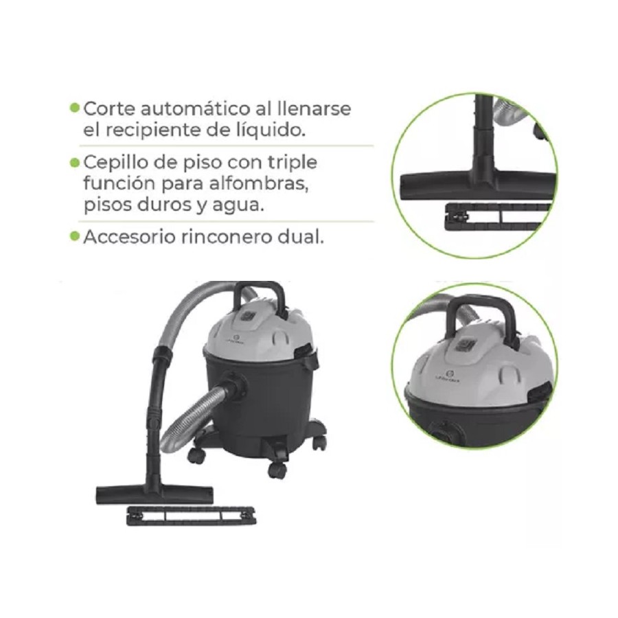 Aspira líquidos y polvo. Capacidad 18 lts. Potencia: 1200 watts. Gran poder de succión. Función soplado. Filtro HEPA lavable y de fácil desmontaje. Cuerpo totalmente aislado. Corte automático al llenarse el recipiente de líquido. Cepillo de piso con triple función para alfombras, pisos duros y agua. Accesorio rinconero dual. Control manual de nivel de aspiración. Barral de tres tramos plásticos. Ruedas giratorias que facilitan el desplazamiento.
